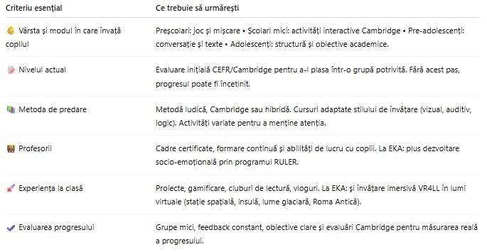 Criterii esențiale pentru alegerea cursului de engleză - tabel util